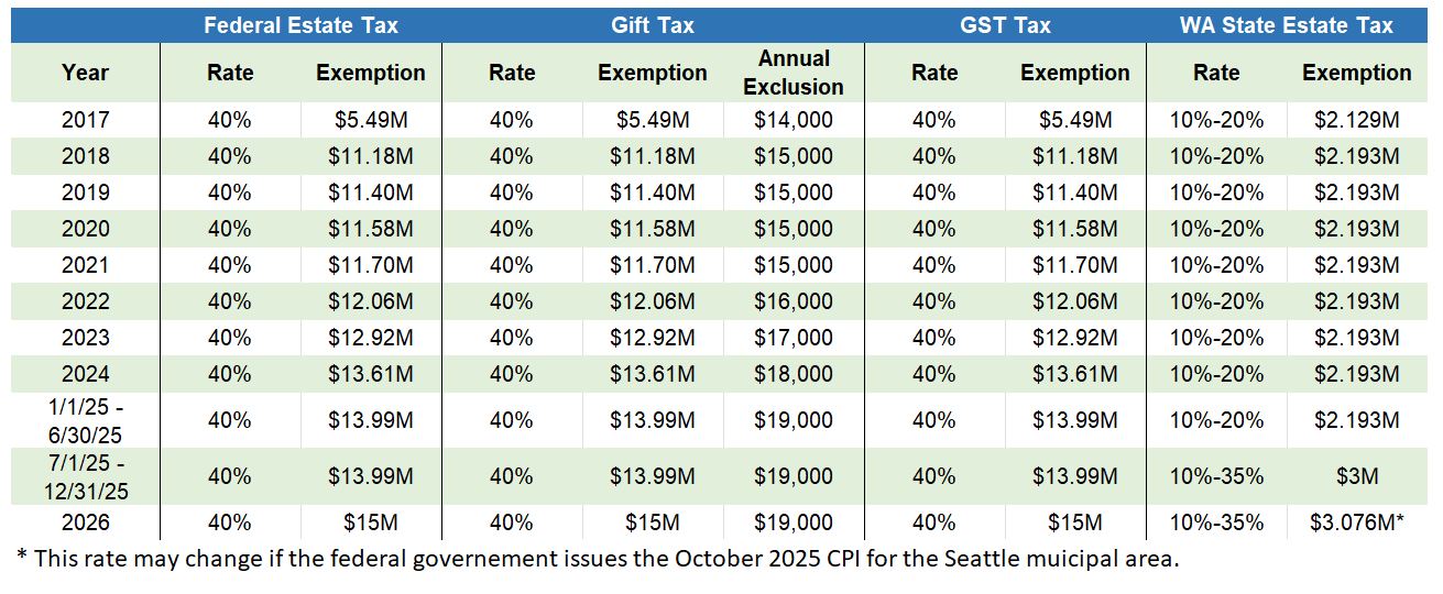 After years of holding the Washington State estate tax exemption at $2,193,000, on July 1, 2025, the State legislature raised the exemption to $3,000,000 per person beginning July 1, 2025, with inflation adjustments each January thereafter. However, due to the federal government shutdown during October 2025, the U.S. Bureau of Labor Statistics has still not issued an October 2025 CPI for the Seattle municipal area, which is the CPI that Washington uses to adjust its estate tax exemption. Currently, Washington is relying on the August 2025 CPI for the Seattle municipal area and declaring an inflation adjusted estate tax exemption for 2026 of $3,076,000. However, they have reserved the right to adjust this amount if the federal government issues the October 2025 CPI.